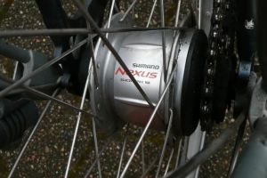 Silbergraue SHIMANO „NEXUS“ 8 – Gang – Nabenschaltung (Schaltnabe SG-8C20 VIA) mit Rücktrittbremse, NEXUS Brems- und Schalthebel-Kombination, Nexus Bremshebel, SHIMANO „V – Brakes“ – Felgenbremsen, vorne mit integriertem Bremskraft-Modulator
