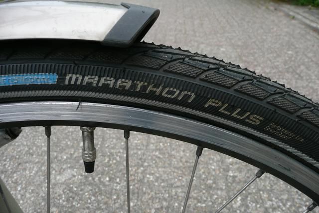 Schwarze, geöste MAVIC A 719 Hohlkammerfelgen mit Niro-Speichen; schwarze 28“ SCHWALBE MARATHON PLUS Pannenschutzbereifung mit Reflexions-streifen, genaues Format: 40 x 622.