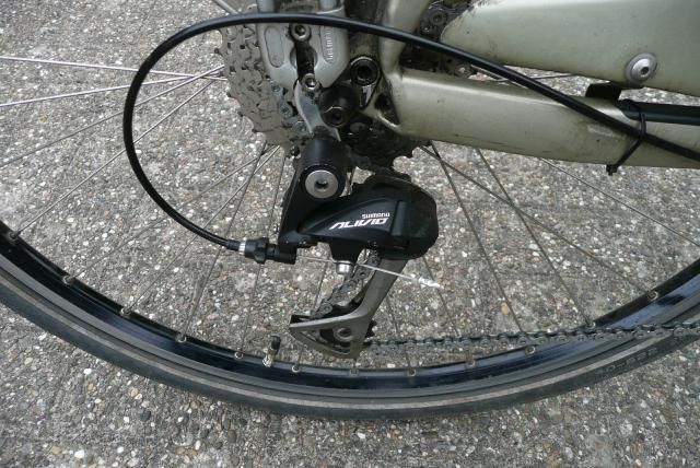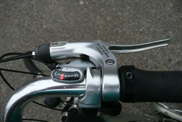SHIMANO „NEXAVE“ 18 – Gang (2x9) – Kettenschaltung: Schalthebel und V-Brakes mit in den Bremshebeln integriertem Bremskraft-Modulator „ALIVIO“ Schaltwerk (neu), NEXAVE „FH-M510 VIAM“ Hinterradachse, NEXAVE Tretkurbelgarnitur.