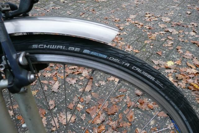Silbergraue, doppelt geöste 28“ MAVIC T221 Hohlkammer-felgen; SCHWALBE „DELTA CRUISER vorne, hinten REXWAY Markenbereifung mit Reflexionsstreifen; genaues Format: 37 - 622 (holländisches Standartformat).