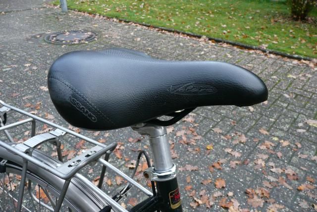 Sportlicher Selle BASSANO „Volare“ gepolsterter Tourensattel auf einer Alu Sattelstütze montiert.